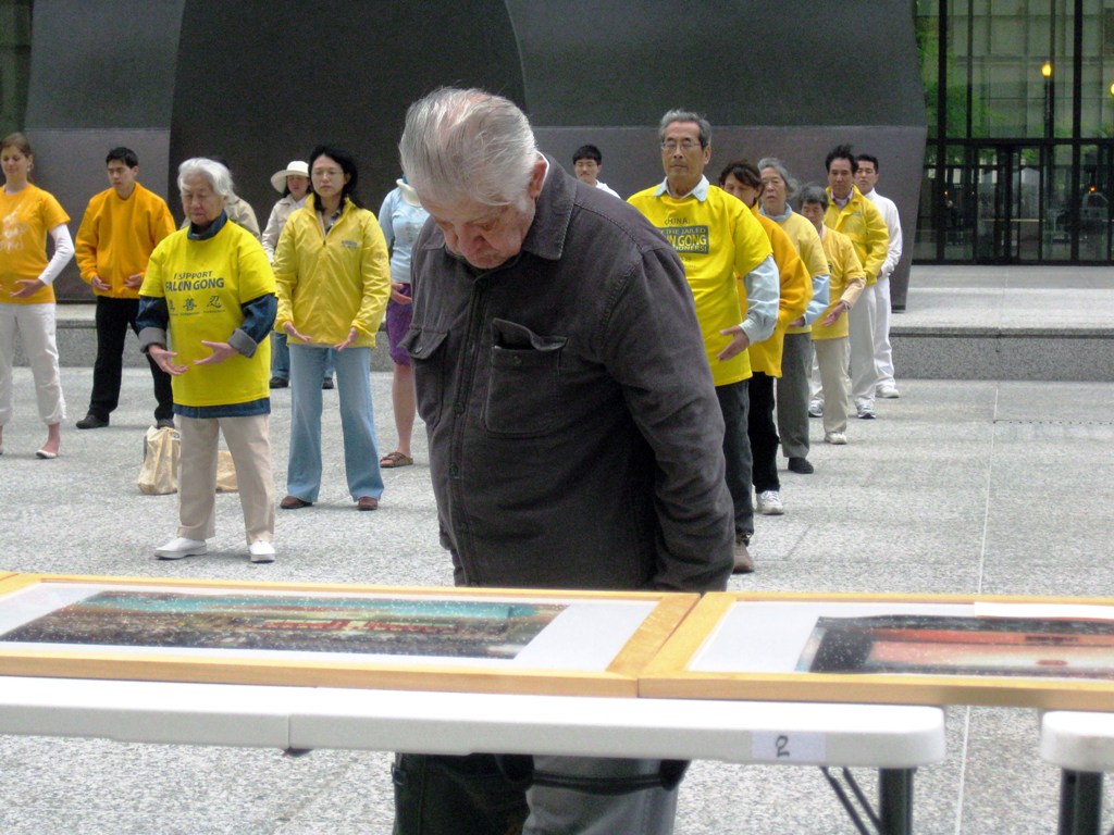 虽然当天风城的气温骤降十几度,路人还是纷纷驻足观看。一位来自巴西现居芝加哥的女士把每张照片都仔细看过,她表示,共产党对法轮功的镇压一定不会成功,邪恶一定不会得逞。这位女士曾在中共领事馆前面看到过法轮功学员炼功,她还表示想要学习法轮功。曾在社服机构工作的拉莫斯(Ramos)先生仔细观看了图片展后也表示想要学习法轮功的兴趣。