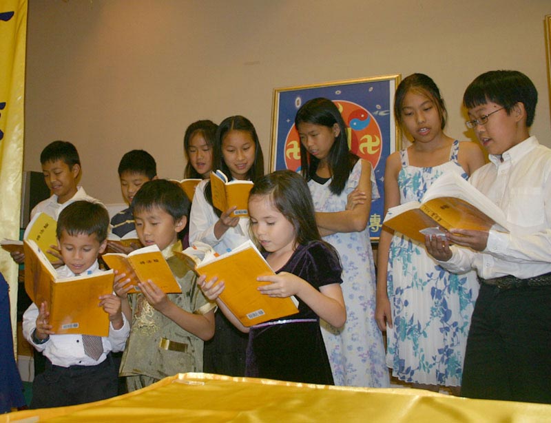 魏女士代表德克萨斯州明慧学校师生发言:“明慧学校的九年历程,主要在学法上落到实处,开始时这一点做起来较难,学员都很忙,睡觉少,很晚才能学法。经过时间的调整,学员带大法小弟子学法的习惯坚持下来了,小同修進步很快。”魏女士发言完毕之后,明慧学校大法小弟子每人用几句话表达了自己的修炼情况,并且共同朗读了《转法轮》片断,学员以掌声鼓励。