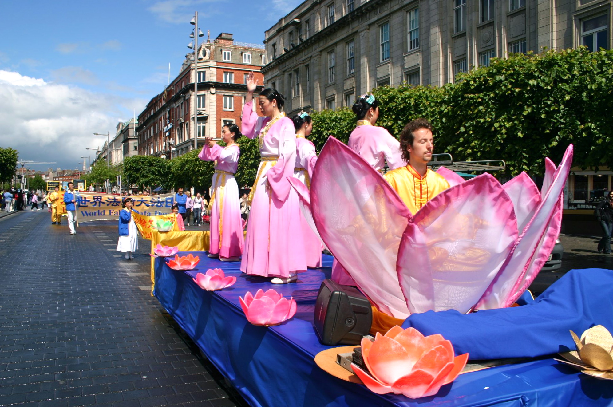 学员们装点了一辆美丽的莲花花车,在一个巨大的粉色莲花中,一位西方学员身着金灿灿的炼功服,展示法轮功双盘打坐的第五套功法。四位粉妆“莲花女子”分别展示法轮功其他四套舒缓优美的功法。游行队伍经过华人聚居的帕奈尔街时,许多华人走出店外目不转睛地观看。游行队伍经过繁华的奥康奈尔大街时,吸引了很多爱尔兰民众驻足拍照,有的目光紧随着游行队伍,试图了解每个横幅上传达的善的讯息,人们纷纷索要传单希望更多了解法轮功,有两位爱尔兰女士说已经开始学炼了。