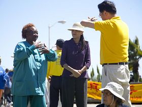 法轮功学员们宁静祥和的集体炼功场面和功法演示也吸引了很多游人、过客,许多人现场学习功法。一位路经此地、自称叫Empress的女士说“很酷”,她能感到一种能量,“他们很舒服,而且很纯净。”Empress说,不仅自己想学炼法轮功,还想带更多的人来,“每个人都应该抽时间来看一看——这样才对得起他们自己。无论什么文化背景的人,他们都需要了解如何与自己的身体取得共鸣,最捷径的方法就是入定打坐了。”