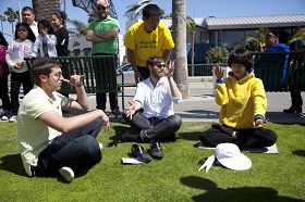 圣塔莫尼卡码头是洛杉矶的著名景点,喜欢扎在海边的人,也象海鸥一样自由闲散。随着法轮功学员陆续来到码头绿地上开始静静地炼功打坐,在悠扬的音乐衬托下,给码头带来一派殊胜祥和的气氛。