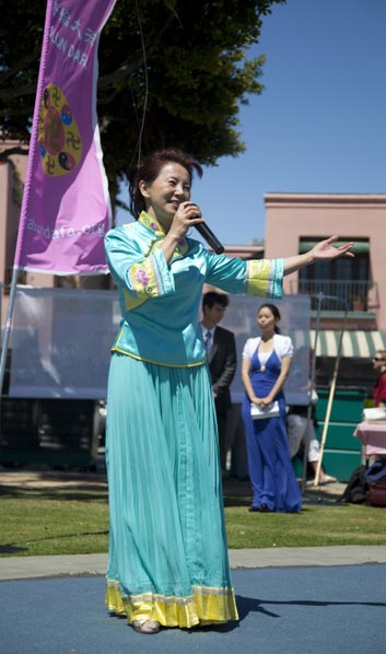 在庆祝活动中除了集体炼功,法轮功学员还表演了歌舞等节目。武术大师李有甫在一九九六年开始接触法轮功、至今已经修炼十几年。此次为恭贺师尊六十华诞,他特意表演了一套八卦掌。他那如行云流水般的步伐和游走的手掌,引来观众阵阵掌声。李有甫说,能跟随李洪志师父走到今天,心里有无限感恩和荣耀,并指出法轮大法为人类道德回升带来了希望。