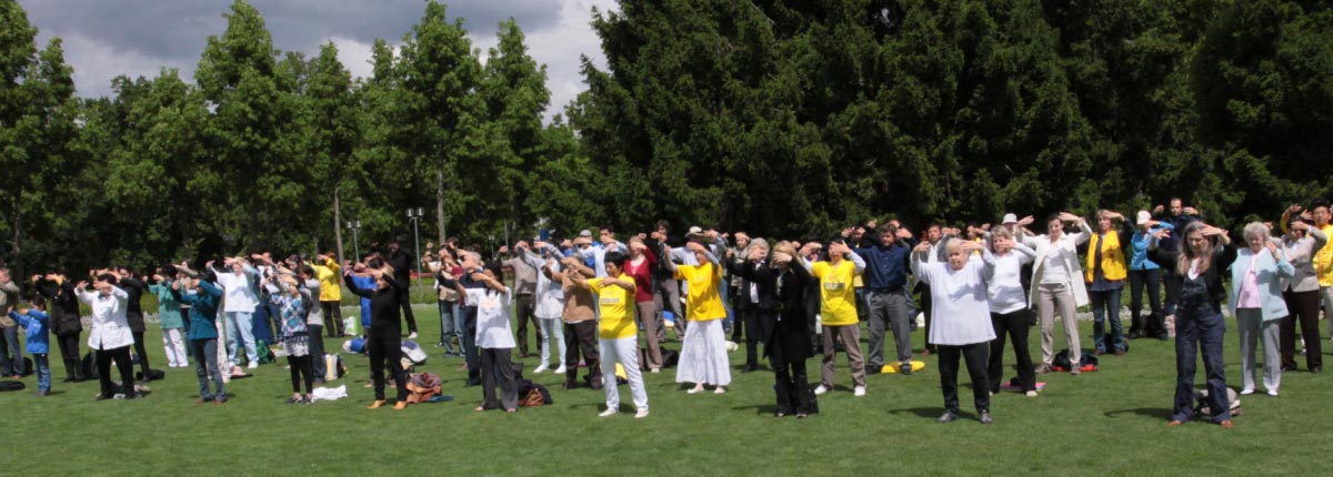 '法轮功学员在瑞士首都伯尔尼玫瑰园集体炼功'