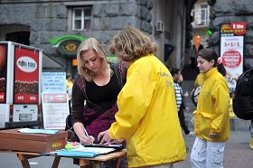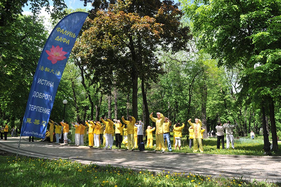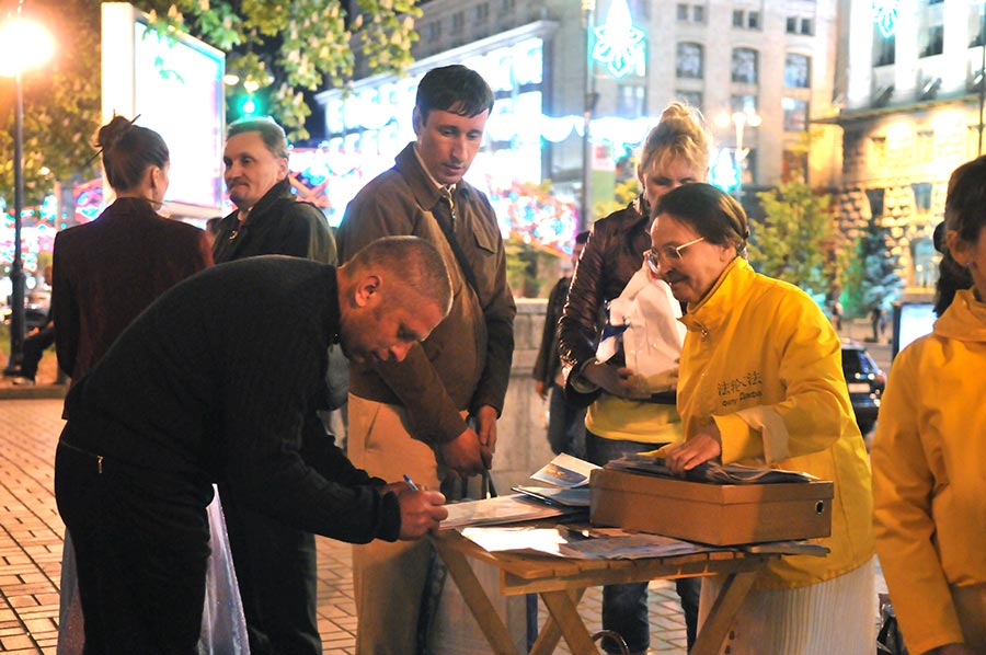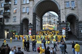 次日,十四日中午,法轮功学员们在基辅市五处景点同时开始举行庆祝活动。盛装的仙女,欢快的腰鼓表演,祥和的炼功队列,飘扬的彩旗,圣洁的纸莲,甜美的微笑……傍晚六点,所有的法轮功学员又汇集到市中心“荷里夏”大街,继续向世人传播善的种子。
