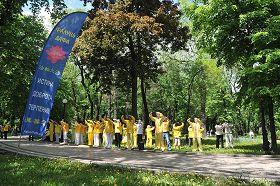 十四日,乌克兰法轮功学员在基辅市中心展示法轮功功法,庆祝第十二届世界法轮大法日。
