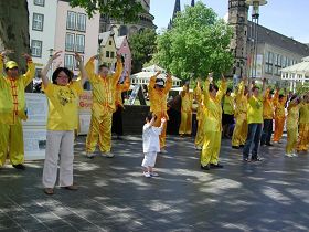 二零一一年五月八日,在科隆游人聚集的莱茵河畔,法轮功学员身着金黄色的炼功服,自然有序地排列成队,随着炼功音乐演炼法轮功的五套功法,顿时为此地增添了一道亮丽而特别的景观。祥和、优美的炼功音乐及和缓舒展的功法动作,吸引众多游客纷纷停下脚步观赏,许多人立刻拿起照相机,抓拍这个特别的场面。