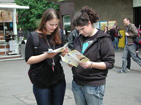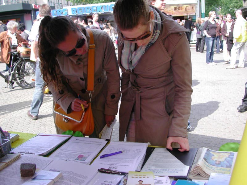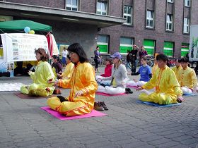 五月十四日,由四十三个国参赛的欧洲歌唱大赛的决赛正在杜赛尔多夫举行,这个星期六进出中央火车站的乘客比平日多出几倍。北威州法轮功学员们在站前广场上演示功法、并向过往路人讲真相。许多人索要真相材料,了解了真相的人们纷纷签名支持法轮功、谴责迫害。还有的人表示要学炼法轮功。