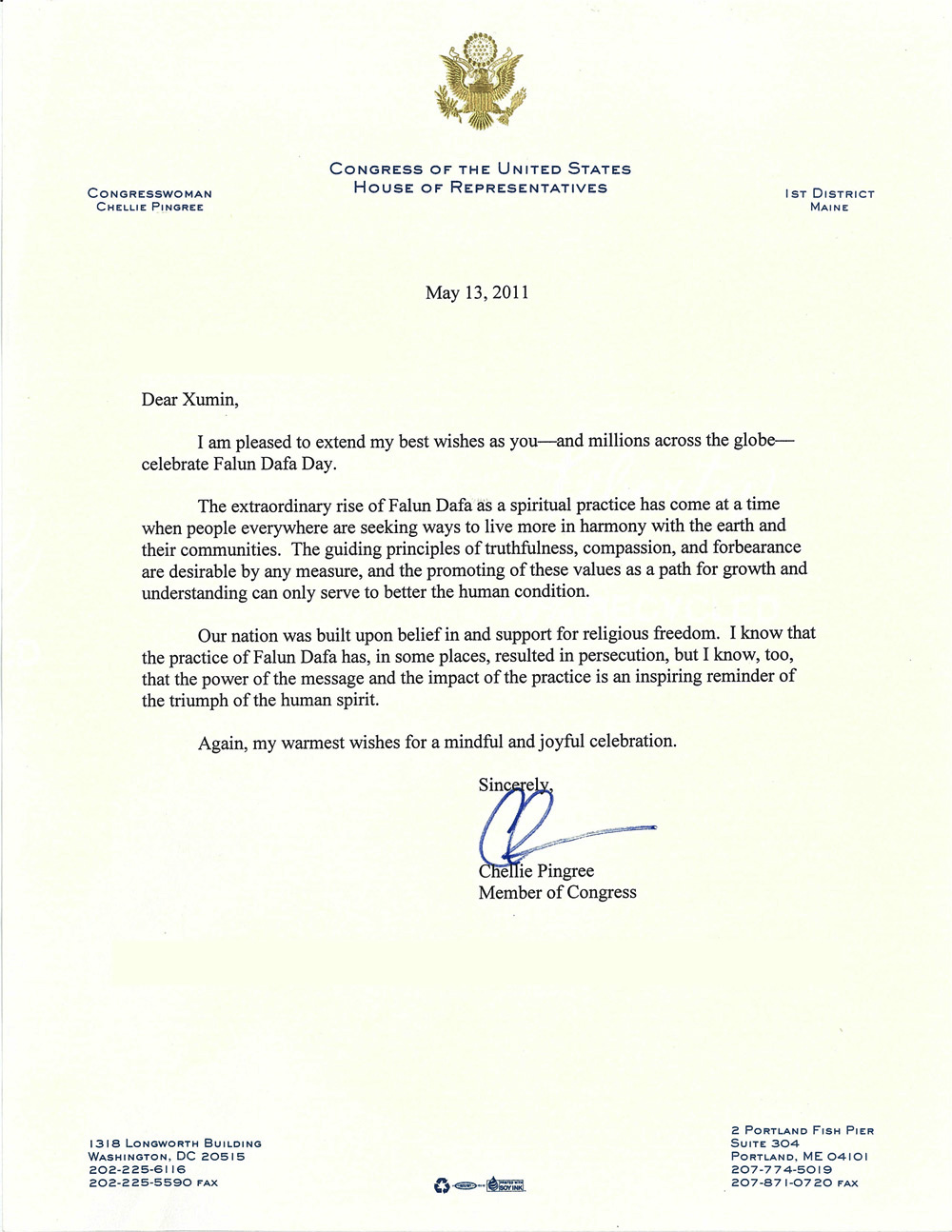 【明慧网二零一一年五月十八日】五月十三日是世界法轮大法日,为此,美国缅因州国会众议员车丽•平格瑞(Chellie Pingree)发来贺信,并赞扬法轮大法学员在社区弘扬“真、善、忍”,给社会的福祉。