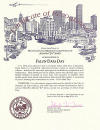 因此,我,市议员琼兰达•琼斯(Jolanda Jones),以诚挚感谢的心情,谨代表休斯顿市,市议会,及二百多万休斯顿市民,表达对法轮大法日的祝贺。
