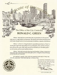 二零一一年五月十三日世界法轮大法日来临之际,美国休斯顿审计长罗纳德•格林(Ronald C Green)褒奖法轮大法,并宣布二零一一年五月十三日为“法轮大法日”。