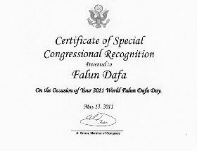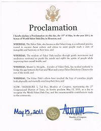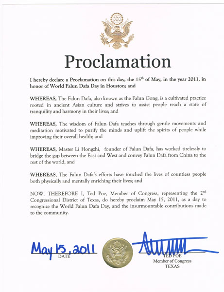 鉴此,我,泰德•鲍(Ted Poe),代表德克萨斯州第二选区的国会议会,于二零一一年五月十五日褒奖世界法轮大法日,以及法轮大法对社区所做出的不可超越的贡献。