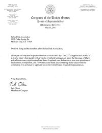 在欢庆法轮大法日之际,我向你们表示祝贺。第22国会选区是个多元文化区。这里的民众有多元文化背景。他们享受到自由,庆祝许多重要的文化节日。我祝贺你们坚持真、善、忍的原则,并感谢你们将这一价值观与社区分享。能在美国众议院代表你们,我感到荣幸。