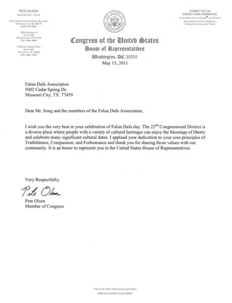 美国德州国会议员彼特•欧森(Pete Olson)向法轮大法学会发来贺信,祝贺法轮大法日。贺信译文如下: