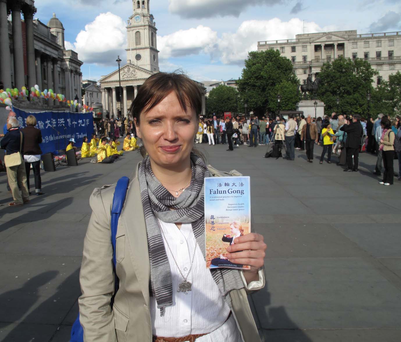 活动当天,阿妮塔在参加周六中午的公园集体炼功时,听到了英国学员庆祝世界法轮大法日的消息,于是她在结束炼功后匆匆赶到鸽子广场参加庆祝活动。问及她的修炼感受,阿妮塔表示,她终于有缘找到了法轮大法,法轮大法给了她最美好的感受。她说: