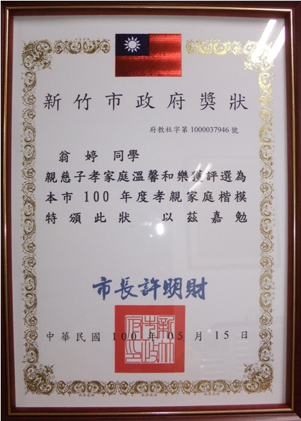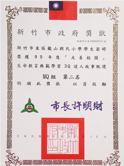 ![]() 翁婷是台湾新竹市东区龙山国小六年级学生,课业表现优异、品德良善;为人谦虚有礼富有爱心,与同学互动良好,荣获新竹市MQ(道德智商)达人第二名奖状 |