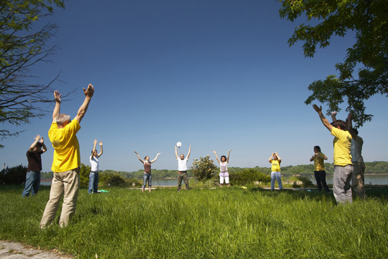 当天上午,学员们来到与罗马尼亚隔河相望的多瑙河边的公园草地上集体炼功。初春的阳光温暖明媚,小鸟的歌声和渡轮的汽笛声伴随着悠扬的炼功音乐响起,当地和渡轮上下来的各国游客看到了“法轮大法好”的横幅,并阅读法轮功真相传单。