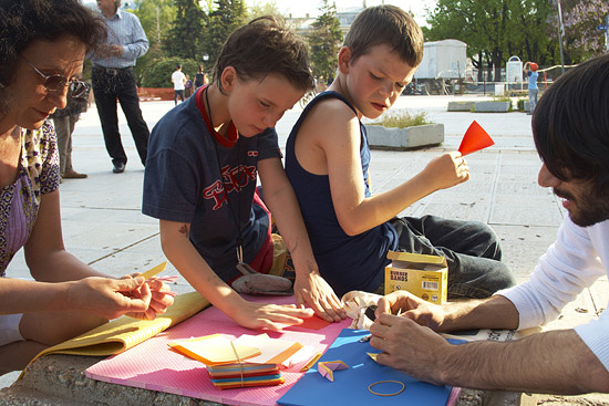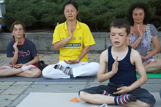 有两名十多岁的小孩来学习折莲花,一名学员教他们折出了属于他们自己的美丽莲花。另一位学员教他们学会了用中文说“法轮大法好”,然后他们还想学功法,两个小孩都很轻松的学会了双盘的坐姿。之后,他们还教其他的小朋友用中文说“法轮大法好”。随后“法轮大法好”的童声在自由广场上不停的想起。