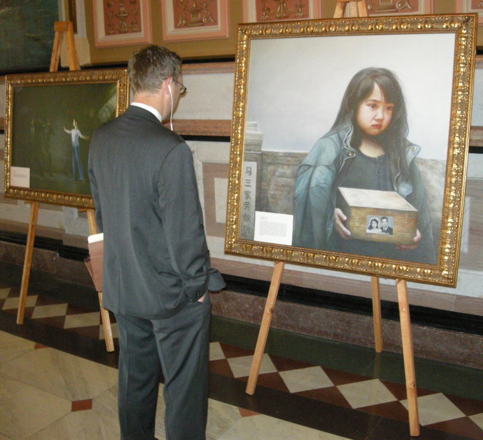 波科先生(Daniel J. Burke)是位有着二十多年经历的资深州议员。一天下午他径直到前台,告诉学员,他已经看了所有的画,“Pictures are magnificent!”(这些画太动人了),他在最能打动他的那幅画前,和学员留影。他指着这幅画说,“这就象在十字架上受难!”他告诉学员他去过中国两次了,他了解法轮功受迫害的真相。学员希望他在面对中共官员时,能够坚定地表达美国民众对中国人权受迫害的关注。他表示,一定会这样做的,因为他的选区有很多的中国人。