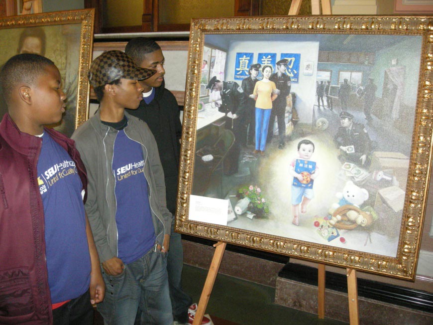三位高中生来自芝加哥,他们的团体是为了呼吁不要削减家庭护理的预算来到州政府的,他们意外地有机会看到了真善忍美展。他们看得很仔细,又听学员的讲解,被深深地感动了。其中一个男生告诉学员,他本人就是学油画的,却从没见过如此打动他心灵的作品,他留言说,“These pictures I have seen are really deep to me, the people should not be treated like that just because they want peace.”(这些画使我感动,人们不应该只是因为他们和平的信仰就遭受那样的对待。)