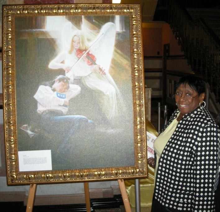 她说,“等这次议会结束后,我一定会去找当地的学员,我想试着炼法轮功,”她非常喜欢学员们赠送给她的美丽的手叠莲花。第四天,她又来到画展前台,告诉学员,她的老朋友也是一名州议员,她也想要一朵莲花,她就把议员带到了画展,介绍给了学员。这位议员是二十七选区的莫尼卡•戴维斯(Monique Davis),她自从一九八七年就被选为芝加哥南郊区的州议员,一直连任到现在。她很高兴和学员在画作前合影,并且告诉学员她在去年听说法轮功在中国被迫害的事实,她认为这个画展很有意义,她支持法轮功。