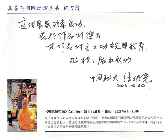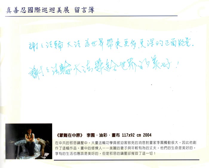 ![]() 观众欣赏完真善忍美展画作后的留言 |