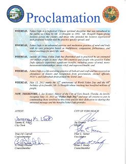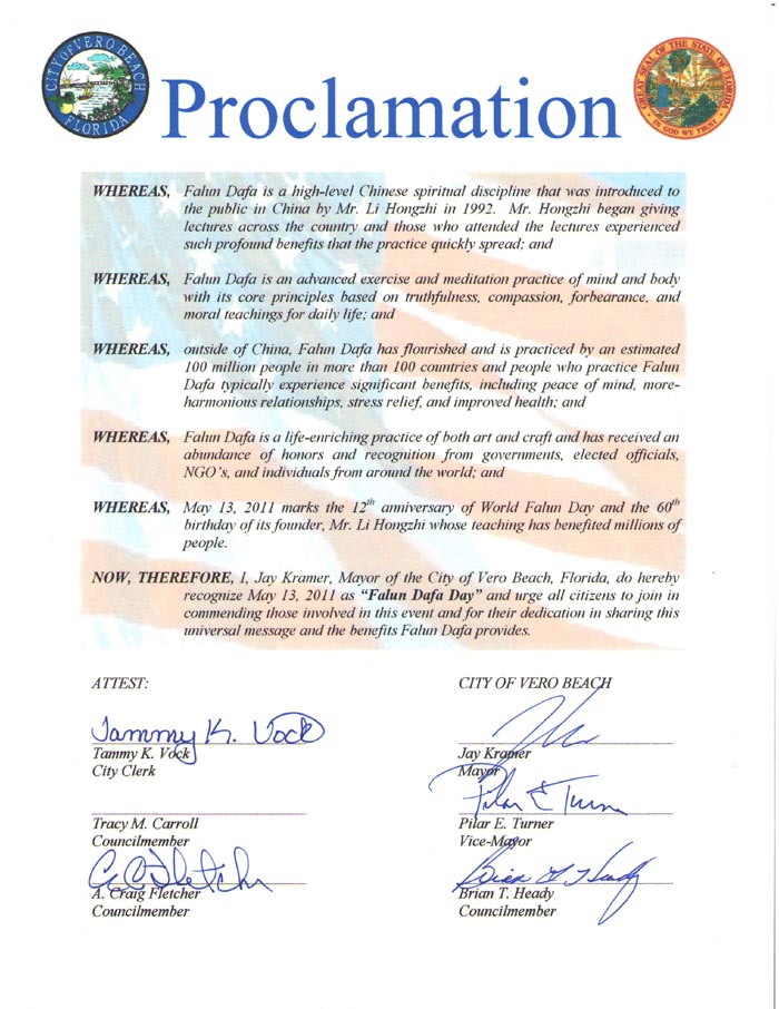 所以现在,我,杰·克莱默,佛罗里达州维罗海滩市市长,确认二零一一年五月十三日为“法轮大法日“,并呼吁所有公民赞扬那些参与此事、分享这普世的消息的奉献精神,和法轮大法所带来的所有益处。