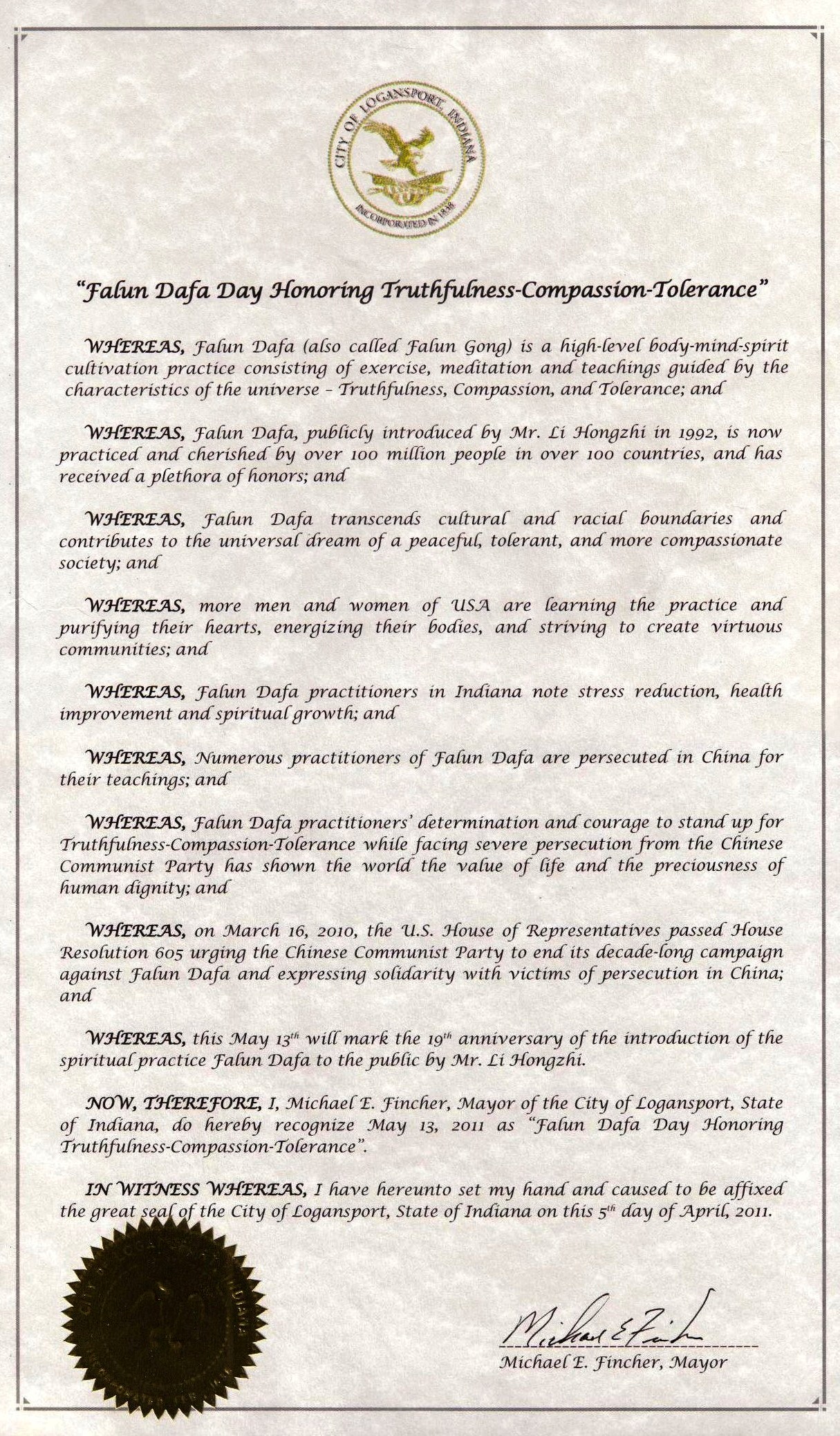 鉴此,我,印第安纳州罗根斯泊特市市长迈克儿·芬奇,特此宣告二零一一年五月十三日为印第安纳州罗根斯泊特市“颂扬真、善、忍的法轮大法日”。