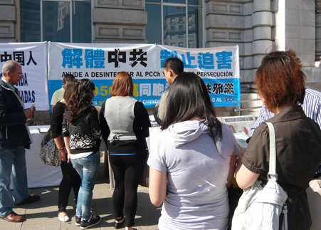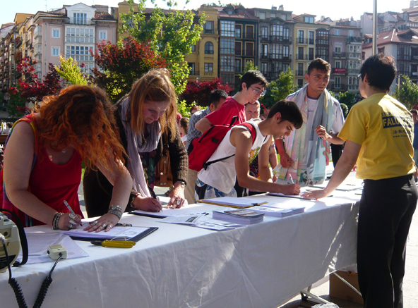 还有一位刚刚移民到西班牙的中国人路过这里,他非常吃惊地看着写有“解体中共,制止迫害”的大横幅。当学员过去告诉他真相时,他说:“真想不到在外国可以这样自由地表达自己的意愿,这在中国是绝对不能想象的。”当学员将光盘送给他并告诉他这是法轮功真相时,他注意到学员所佩带的法轮徽章,他轻声告诉学员说:“我姨妈就是法轮功学员,出国前,姨妈送给我一个护身符,我一直带在身上,我知道真相,也知道九字吉言(法轮大法好、真善忍好)。”学员问:“那你一定知道三退(退出中共党、团、队)的事了?”他笑了,告诉学员:“姨妈已经帮我办理了。”临走,他说:“非常感谢你们所做的这一切!”