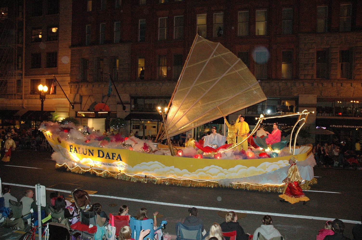 【明慧网二零一一年六月十四日】二零一一年六月四日,美国俄勒冈州波特兰市天气格外晴朗,俄勒冈法轮大法协会第七次应邀参加了当晚的玫瑰节星光游行,华盛顿州大法弟子带来了自己亲手打造的“法船”与波特兰学员一道参加了游行。大法“法船”荣获了两项奖励:最佳灯饰(Best Illumination)三等奖和最佳社区部(Best Community Division)二等奖,据官方报道,有二十五万人观看了本次游行。