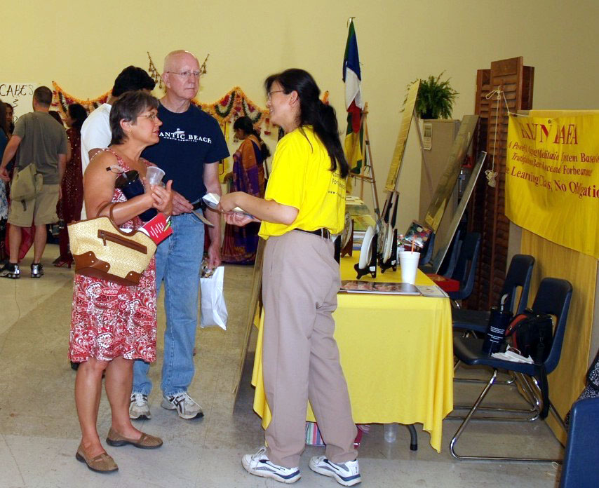 学员们向人们介绍:法轮功教人修心向善,同化宇宙特性“真、善、忍”,使亿万人身心健康,目前已传至世界一百多个国家和地区;然而在其发源地中国大陆,法轮功修炼者们遭受着历史上最邪恶的迫害。有个菲律宾的中年人告许学员,他早就知道法轮功了,在他们的国家就看见有人在公园里自由自在地炼功,只有邪恶的政权才干预人们追求信仰的自由。