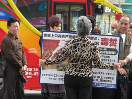 【明慧网二零一一年六月二十二日】明慧网六月十三日的首条报道是《人群总在有真相的地方驻足(图)》,讲的是在台湾著名地标“一零一大楼”周边,法轮功学员向到台湾观光的大陆游客讲真相的事。其中有两张插图,都是一个老太太手中拿着展板向大陆游客讲真相的相片。相片的拍摄角度不同,都是从老人的背后拍摄的,所以可以看到大陆游客认真观看展板的神态,而从老人花白的头发上判断,老人的年龄起码也在六旬开外。她就那么静静地站在那里,双手托着展板,跟前有将近二十个神情肃穆的大陆游客在默默地观看。