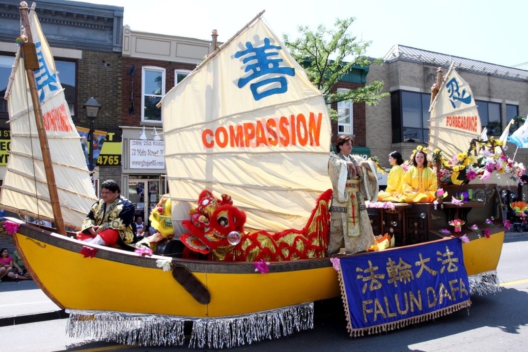 当队伍经过观众台时,主持者介绍说:“天国乐团成员来自多伦多,来自不同的族裔及文化,大部份团员是华人,年龄从十几岁至七十多岁。所有团员都修炼法轮大法,包括打坐及动功,以及遵从宇宙的原理‘真、善、忍’。演奏的曲目包括《法鼓法号震十方》、《送宝》、《法轮大法好》、《法轮圣王》以及《永远的枫叶》。团员来自社会不同阶层及文化背景,天国乐团真正代表着加拿大人引以为豪的多元文化。”