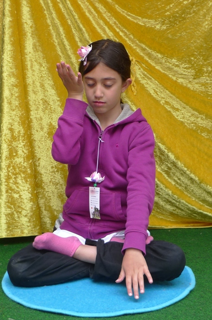 当人们看到六岁的丽莎(Lisa)和七岁的尼科(Niko)展示法轮大法的打坐动作时,不禁惊叹:“这么小的孩子也修炼法轮大法?”两个小姑娘双盘打坐,非常安静,脸上洋溢着轻松祥和,她们不被周围一切喧嚣嘈杂所带动打扰。