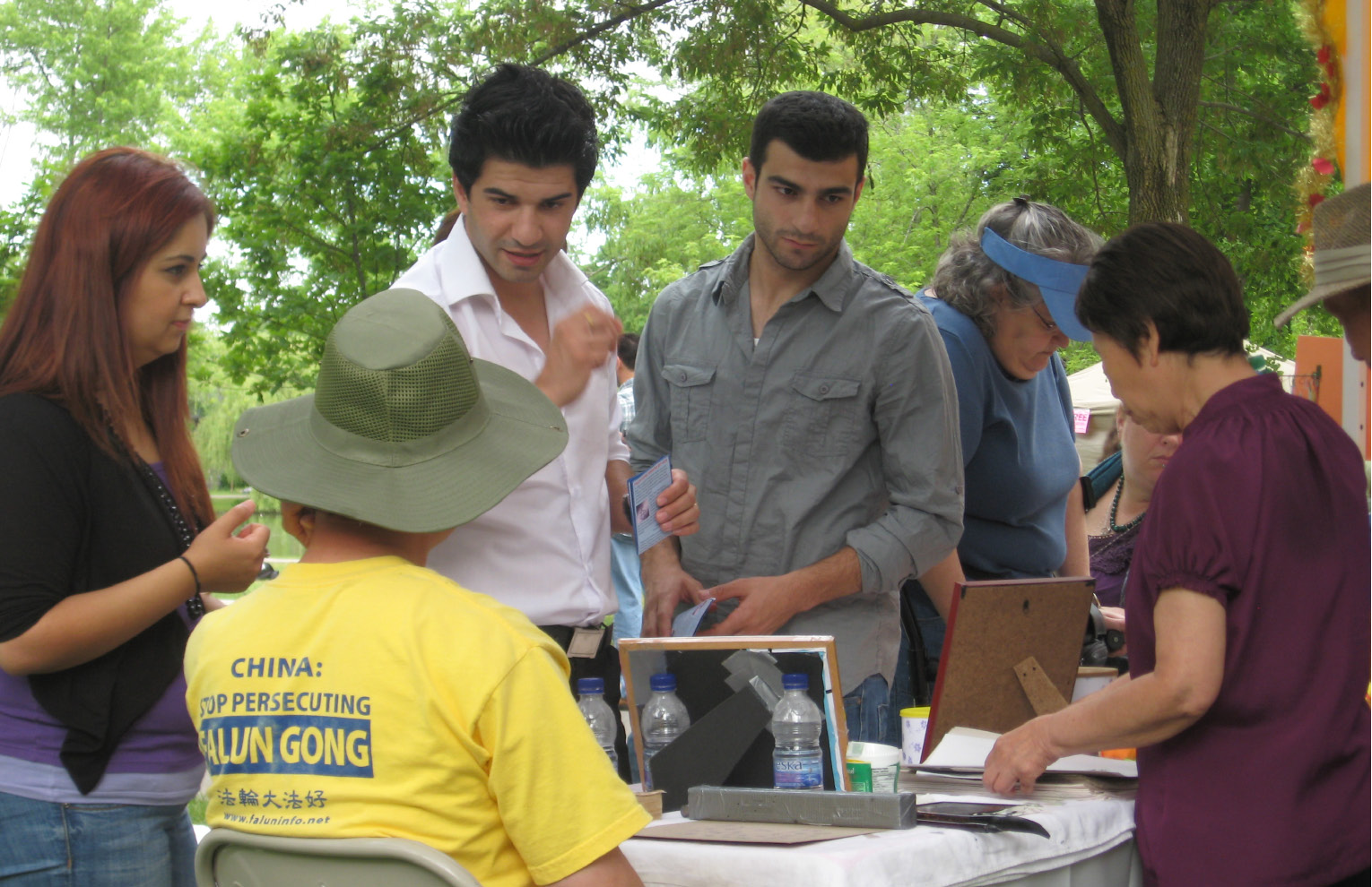 一些来海外求学的年轻学子也用这机会近距离接触法轮功。一对男女青年仔细看了真相展板后,仍想不通中共为何要迫害法轮功,他们又跟法轮功学员交谈了很久。学员告诉他们:“你们太年轻,没亲身经历过中共的历次整人运动。听过狼和羊的故事吧?狼要吃羊,不是因为羊有过错,而是因为狼的本性……”恍然大悟的年轻人欣然接受了真相资料。