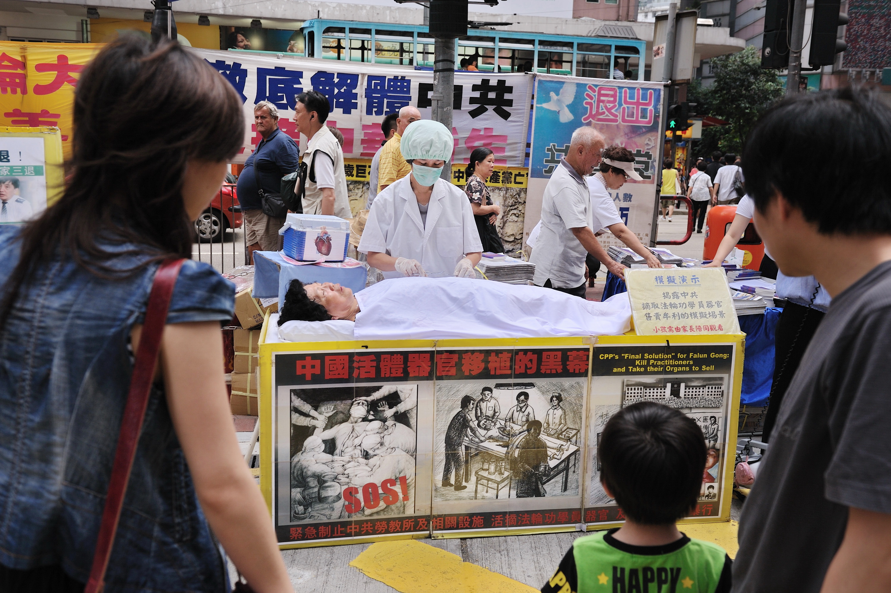 香港维多利亚公园附近的真相点,揭露中共活摘法轮功学员器官的模拟表演