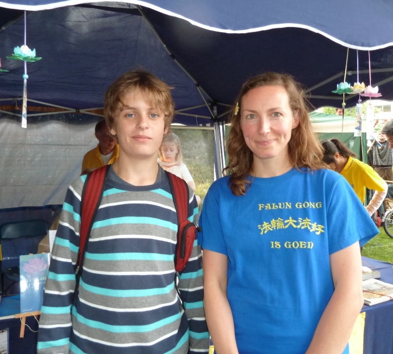 法轮功学员雷娜(Nele)讲述了活动中发生的一个小故事:“我们刚刚把展位准备好,十四岁的男孩西蒙(Simon Gheneyn)就走过来看展板,并且对法轮功功法动作和书籍非常感兴趣。他当即买了《法轮功》,马上读了起来。他还和几个学员讨论关于修炼的问题以及他对人生意义的探索。他说在网上搜索过气功,但是没有找到好的。现在他看到公园里的法轮功功法,他觉得很感兴趣,很想学这个功。法轮功学员尤斯(Jos)教了西蒙动作。看到法轮功学员在炼功,西蒙征得同意,就和学员们一起炼了起来。