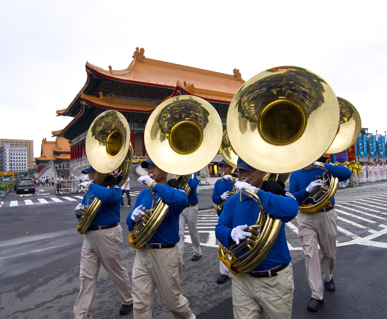 十七日下午的台北大游行自三点半开始,雨戛然而止。引领游行队伍的是二百人组成的天国乐团,大势磅礴的乐音吸引许多住户及商家的民众出来一探究竟而观看整个游行。