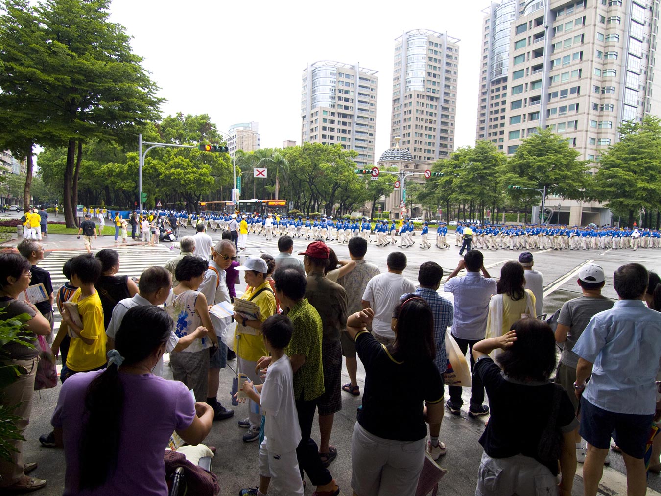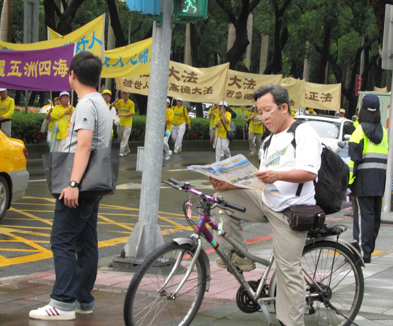 在国父纪念馆附近工作的一位先生,跟随法轮功游行至金山南路才离开。他表示,以前学过法轮功,但觉得自己资质驽钝而未再学炼,今天是他第一次看到法轮功学员游行活动,感到很震撼,不由自主的跟着。他说,真是了不起,这么多人的游行却是非常干干净净、整整齐齐的,不嘈杂,安安静静。他最后双手合十说,你们辛苦了。