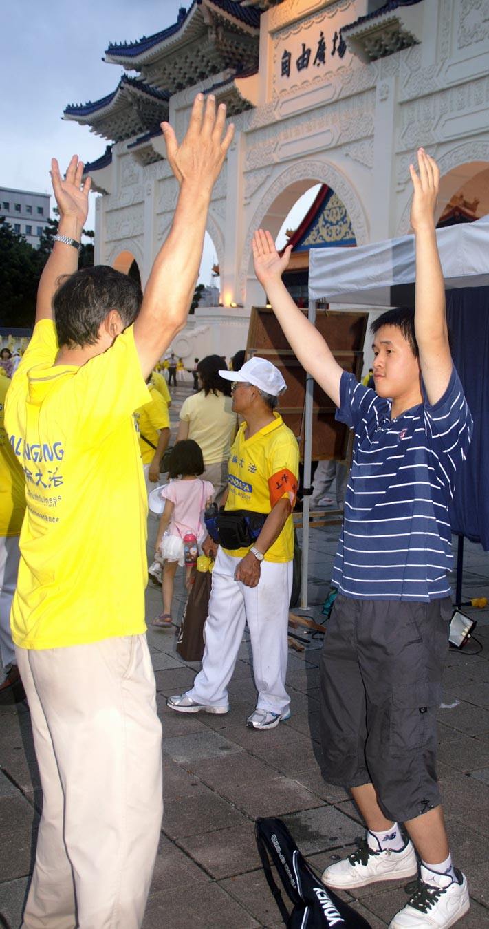 刚从加拿大回台过暑假的林姓少年,迫不及待来到自由广场前向法轮功学员表示想学炼五套功法。去年他的英文补习家教告诉他有关修炼的事,他开始看《转法轮》书籍,每天花一小时课余的时间看一讲法。尽管他还未学炼五套功法,奇妙的事发生在他的身上,从小过敏的体质不翼而飞。
