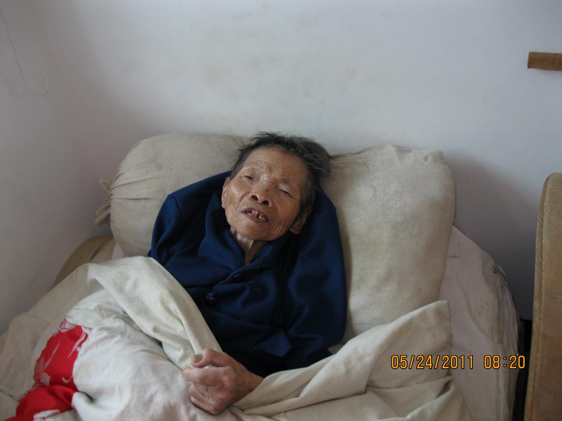 【明慧网二零一一年七月十九日】(明慧网通讯员云南报道)照片上的这位衰弱的妇女,八十五岁,家住云南省昆明市东川区铜都镇石羊村。老人无大病,可为什么这么衰弱?是因为她日日夜夜、分分秒秒的思念她唯一的儿子,吃不下、睡不稳。她的儿子因修炼法轮功被中共非法判刑三年。老人天天叫儿子,悲痛中眼睛也哭瞎了,长期的思念使老人现已瘫痪了,每天在床上只是喊:“存有啊,妈妈想你啊……”