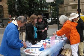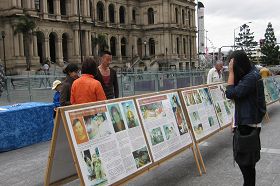 【明慧网二零一一年七月二十日】在中共发起的大规模血腥迫害法轮功历时十二年之际,二零一一年七月十六日,法轮功学员在澳洲昆士兰省首府布里斯本市中心广场上举行了解体中共、制止迫害法轮功的活动。