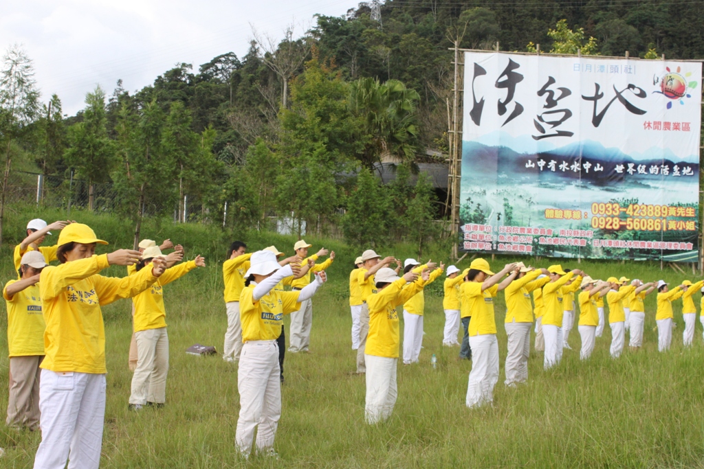 靠近日月潭入口的鱼池乡长红茶休闲广场旁,近百位法轮功学员演示功法。