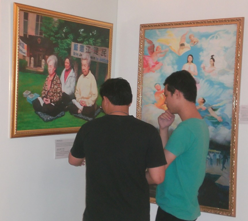 几天来,观看画展的观众络绎不绝,有的被画作展现的祥和美好感动,有的对法轮功学员遭受的迫害震惊,他们感谢画展传递出的法轮功被迫害的重要信息,以及画作给人们带来的希望和光明。