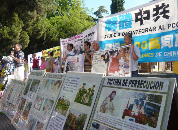 二零一一年七月十六日,西班牙法轮功学员来到中使馆前,揭露中共十二年来对法轮功的迫害,要求惩办迫害元凶, 制止中共的反人类罪行。法轮功学员展开写着“法轮大法好”、“解体中共 制止迫害 ”、“惩办迫害元凶” ,“停止迫害法轮功”等大横幅;活动现场摆放着白色的花环和点燃的蜡烛,悼念为了维护 “真、善、忍”信仰而被中共虐杀的中国大陆法轮功学员。