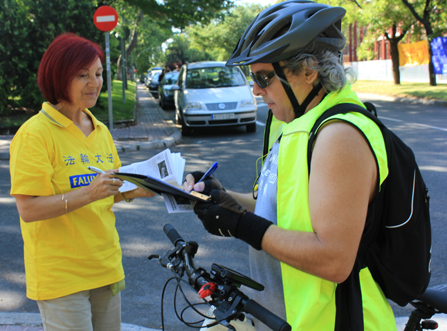 法轮功学员和平抗议的活动吸引了过往民众的目光,并得到他们的热心支持。中使馆所在街区属于富人区,行人不是很多,但几乎所有路过的行人都会停下脚步观看这宁静祥和与肃穆的场面,并签名反迫害。许多经过的车辆放慢车速,司机鸣笛表示支持,或在短暂的红灯停车时接过法轮功学员递上的真相资料。更有好几位开车经过这里的热心的西班牙人特意将车停在路边,走下车在制止迫害的签名簿上签名。