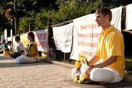 法轮功学员们在使馆对面的马路上排列整齐,心态平和的展示了优美的五套功法;同时,在炼功队伍的另一侧,学员们以模拟酷刑展揭露中共的暴行,过往的行人纷纷签名支持法轮功学员的反迫害活动。