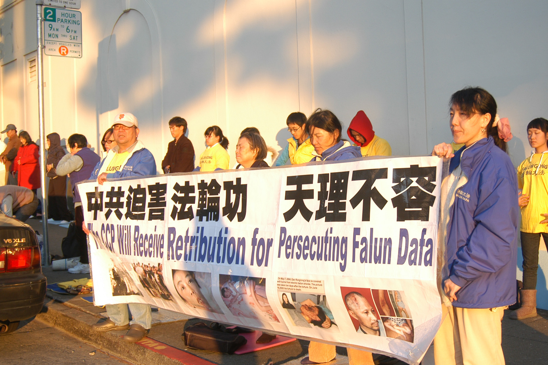 虽然时值仲夏的旧金山,在夜幕降临之时却寒风瑟瑟,法轮功学员们顶着劲风,静静的手持“法轮大法 真善忍”、 “法办迫害元凶江××、罗干、刘京、周永康”、“解体中共 停止迫害”等横幅,点燃点点烛光,以无声胜有声,唤醒着世人。
