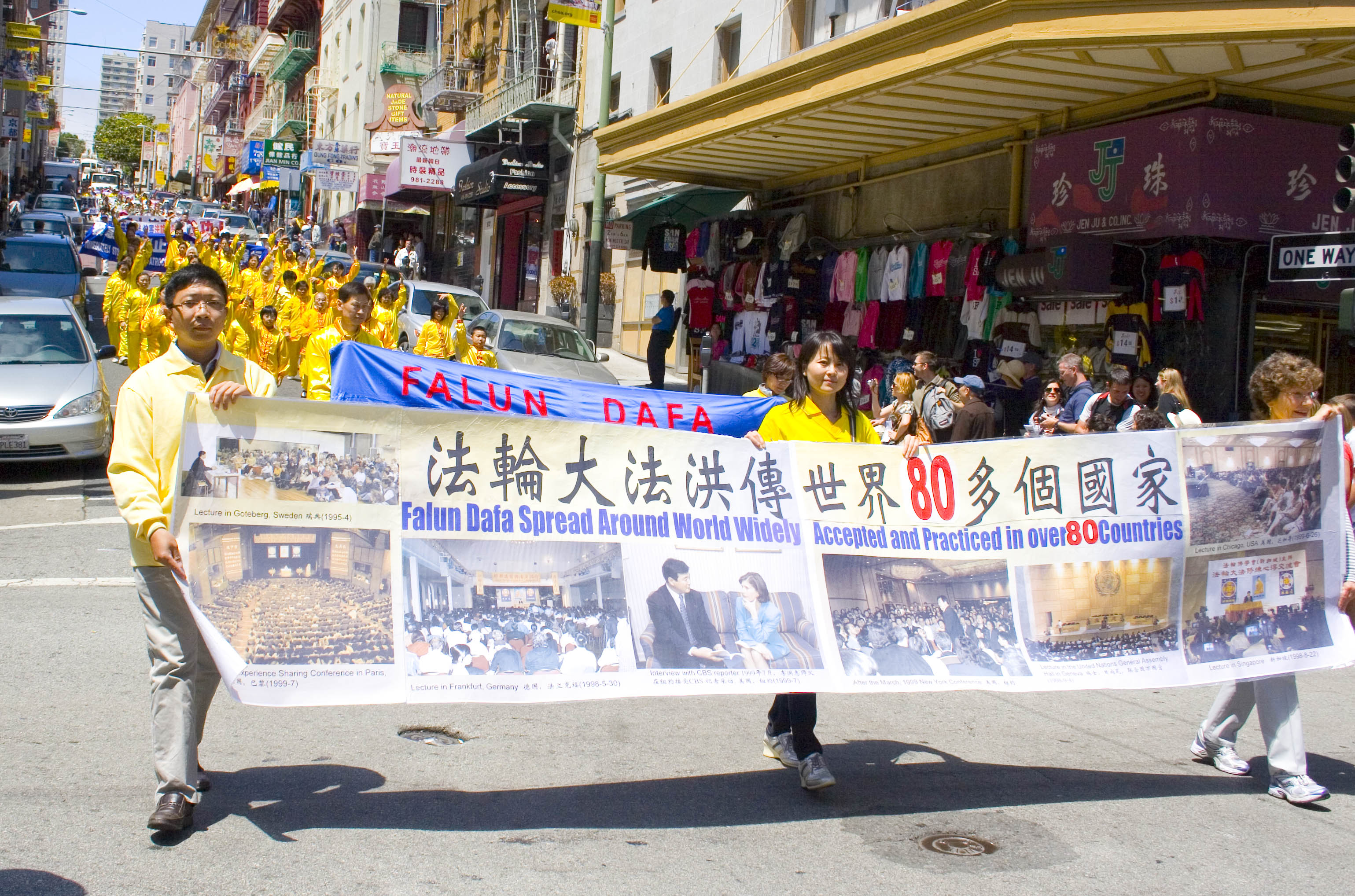 上午十一点半,法轮功的游行队伍组成方阵,走在最前面的是美西天国乐团,跟随的是法轮功祥和的功法演示;随后有反酷刑的展示,悼念被迫害致死的法轮功学员的花圈队;接下来是呼吁正义良知的横幅队。游行队伍从旧金山市中心的Powell街出发,沿途经过市中心繁华街区,进入中国城唐人街,最后抵达唐人街花园角广场。