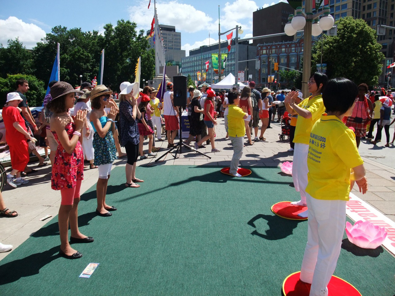 据主办者之一法轮功学员戴工羽女士介绍,除了功法演示之外,今天渥太华、蒙特利尔和多伦多的法轮功学员为民众带来了许多精彩的节目,包括中国民族舞蹈、中国古典舞、法轮大法小弟子表演的腰鼓、天国乐团的演奏、舞狮、独唱等。