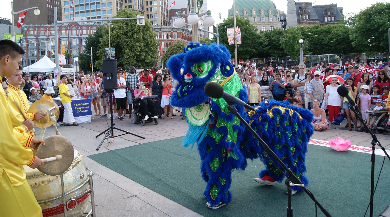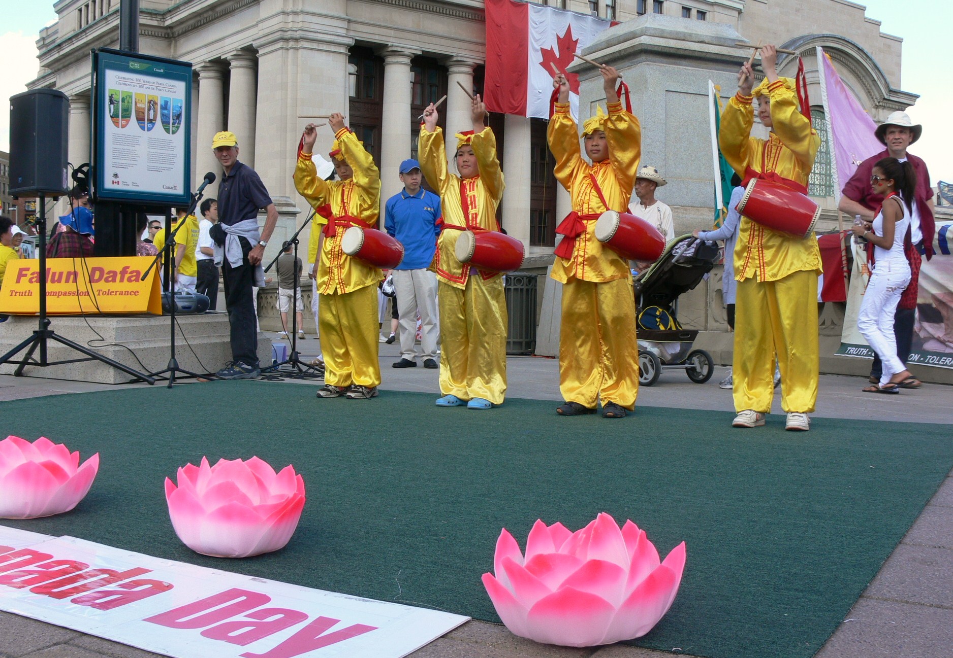 来自蒙特利尔和渥太华的天国乐团为现场的观众演奏了《法轮大法好》、《法鼓法号震十方》、《法正乾坤》、《送宝》、《法轮圣王》和《永远的枫叶》等曲目,人群被乐曲的殊胜震撼,掌声、欢呼声不断。